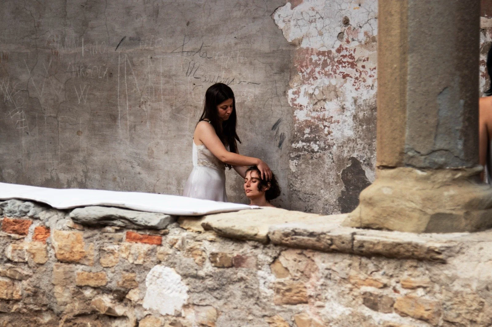 A score of human landscapes, an action unfolding across complementary times and spaces, in which multiple performers move following a sequence of gestures, movements, and signs interwoven with the artist’s poetic verses. Through an apparently disorienting and random path, the intertwining actions create an active suspension in which the said and the unsaid, the written and the described, the enacted and the experienced compose a shared ballad. The artist reminds us “that performance is the staging of a relationship”.